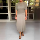- Siluetă avantajoasă: fusta lungă și topul mulat subliniază formele tuturor tipurilor de corp.