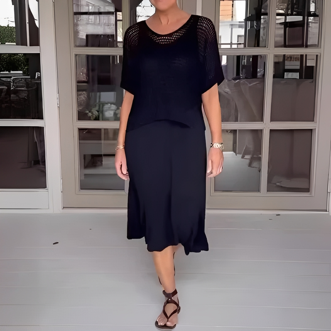 Confort și stil în orice moment: setul Almera în 2 piese combină un stil clasic cu un confort ușor și aerisit. Componența sa include un top tricotat cu mâneci scurte perforate și o fustă lungă și lejeră, perfect pentru ieșiri casual, birou sau mese. Materialul moale și respirabil asigură confort pe toată durata zilei, scoțând în evidență orice siluetă. Designul său versatil facilitează combinarea cu alte articole esențiale din garderoba voastră. Cu Almera, beneficiați de un set elegant, și rafinat și practic.