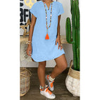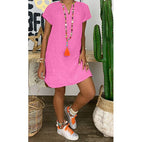 Bucurați-vă de siguranță și stil cu rochia Gina. Ideală pentru zilele de plajă sau excursii relaxante, combină confortul cu eleganța. Fabricată dintr-un amestec de înaltă calitate de in și bumbac, asigură o senzație proaspătă și ușoară pe tot parcursul zilei. Decolteul în V, care flatează, și mânecile scurte, la modă, conferă rochiei o notă feminină și o fac versatilă pentru ocazii casual și semi-formale. Fie simplă, fie elegantă, această rochie cu croială lejeră permite un look elegant cu puțin efort.
