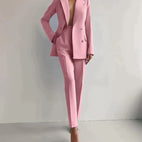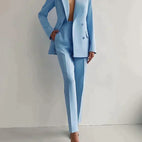 Descoperiți costumul blazer-pantalon Marva – un costum elegant pentru femei disponibil în culori la modă precum albastru deschis, negru, roz și turcoaz. Blazerul modern asortat cu pantalonii prezintă o linie care valorifică silueta și o confecționare atentă din țesătură elastică, care asigură confort pe tot parcursul zilei. Acest costum atemporal este ideal pentru birou, întâlniri și ocazii speciale, și se potrivește atât unui look business, cât și unei ținute casual rafinate.